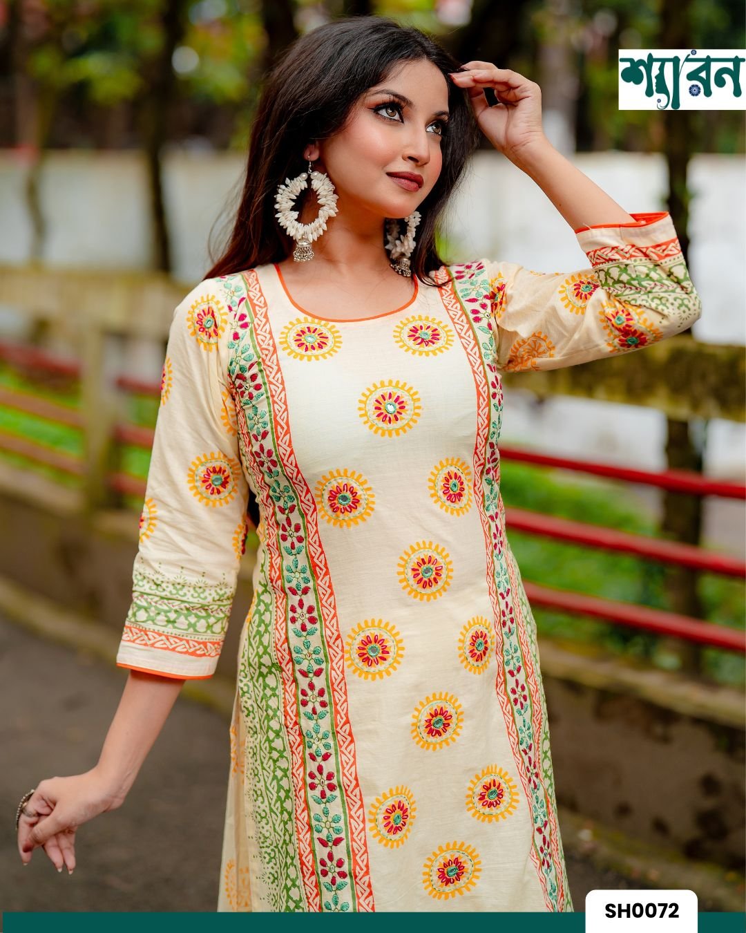 Elegant Cream Kurti with Hand Stitch & Block Prints